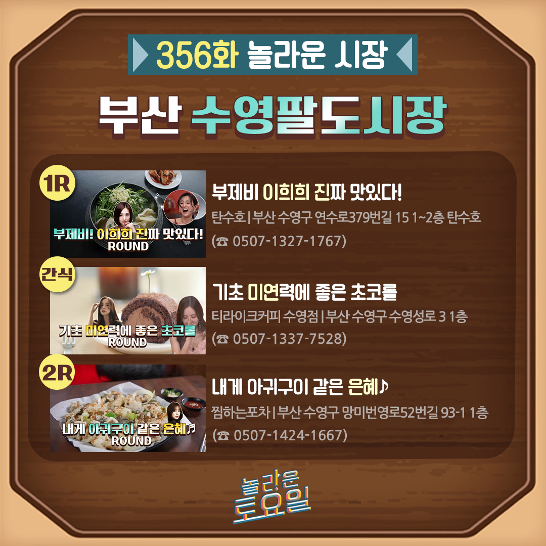 이번 주말, '놀라운 토요일'과 함께 부산 수영팔도시장의 다양한 맛집을 탐방해보세요!