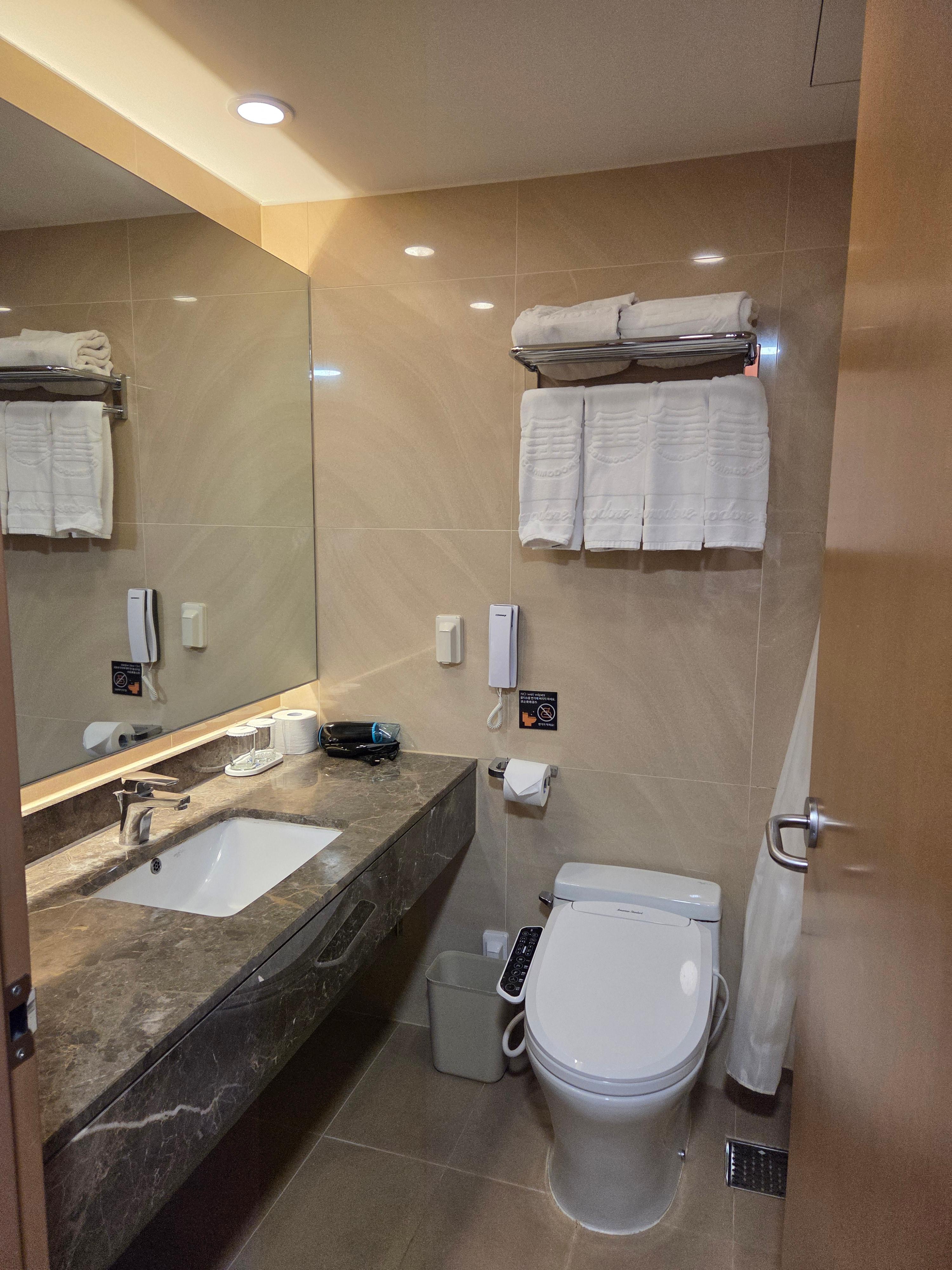 제가 예약한 코모도호텔경주 디럭스 트리플룸은 꽤 넓고 깔끔하게 관리가 되었어요. 하지만, 확실히 연식이 있는 호텔이다 보니 벽지의 색이 바래 있고, 일부 벽지가 낡은 모습은 있었습니다. 다소 노후한 느낌이 있었지만, 방 안의 청결 상태는 좋은 편이었습니다. 산업유산이라는 점에서 전통적인 느낌을 좋아하는 분들에게는 매력적인 요소일 수 있어요. 부부와 5살 아이와 머물기에는 쾌적한 편이었습니다. 일반적인 욕조가 있어서 물 받아서 아이와 목욕을 했는데, 무척 좋아했어요.
