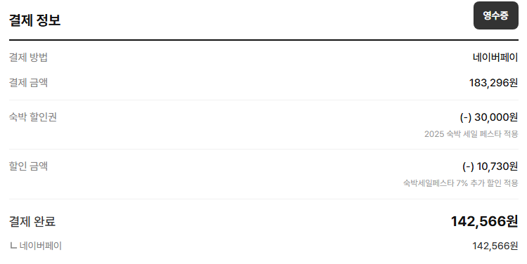 대한민국 숙박페스타 세일을 활용해서 3만원 할인을 받고, 트립비토즈 할인까지 활용해서 142,566원에 디럭스 트리플룸을 예약했어요. 숙박 하루 전에 예약한 것 치고는 선방한 느낌입니다.