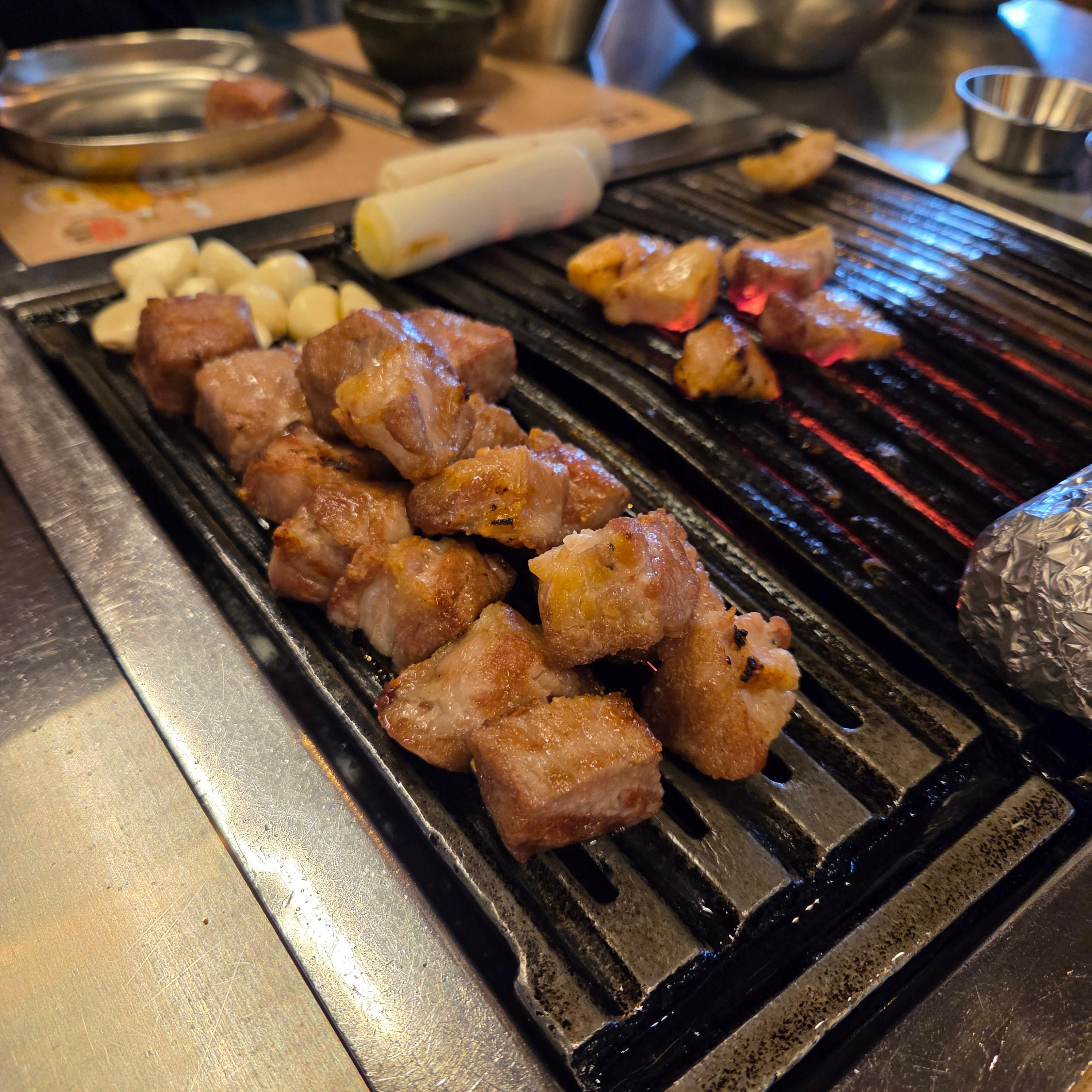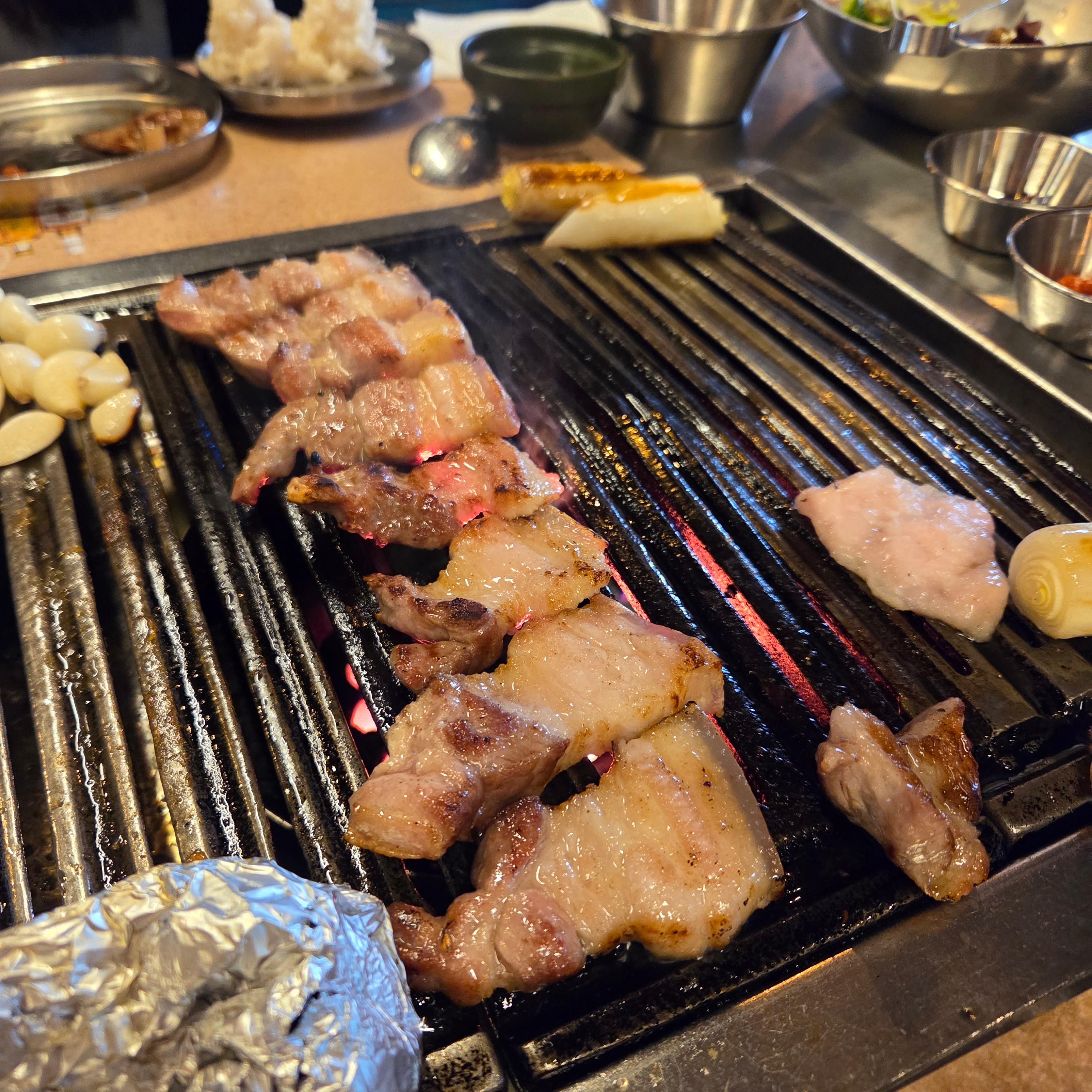 등삼겹살은 삼겹살과 비슷하지만, 등쪽 부위라서 더 쫄깃하고 담백했습니다. 느끼하지 않고 깔끔하게 먹을 수 있었어요.