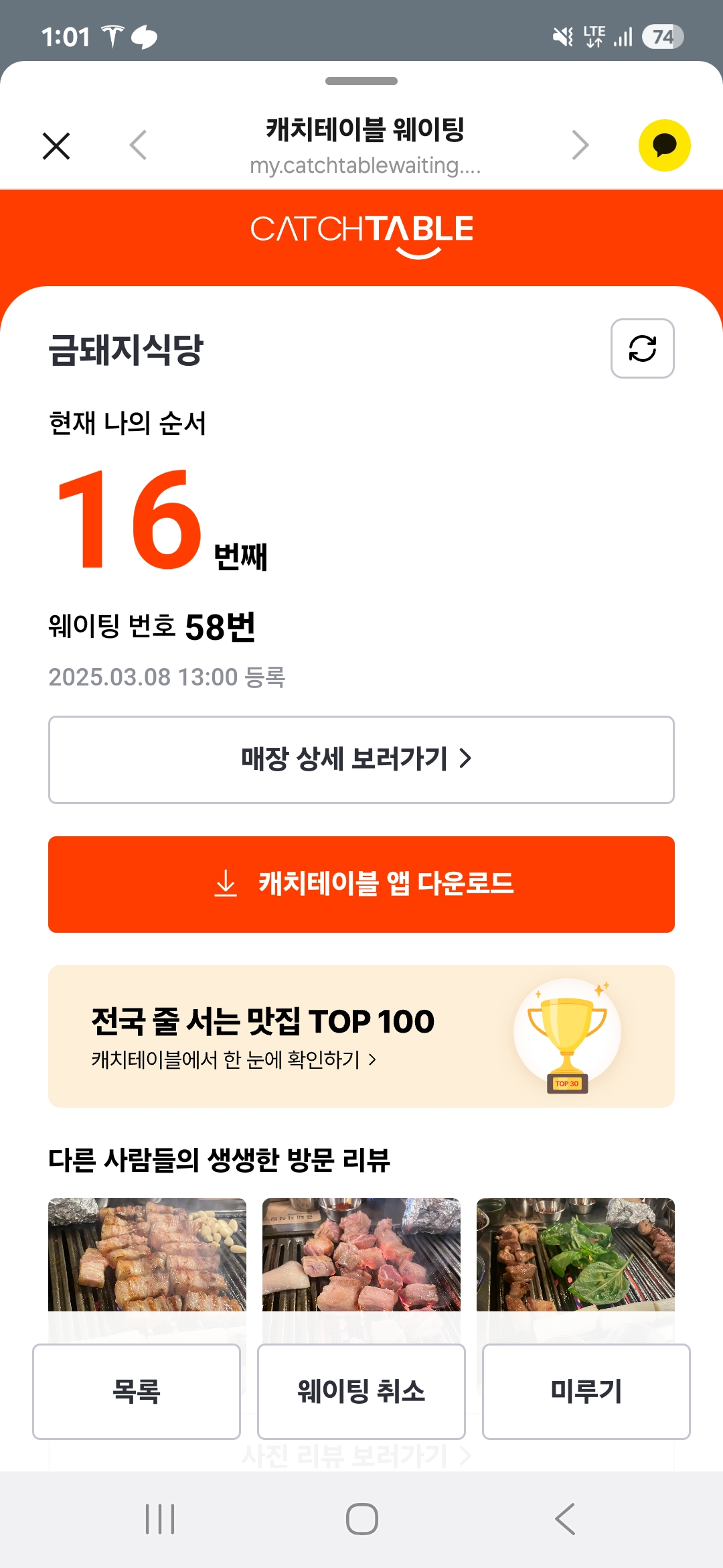 금돼지식당은 예약 없이 방문하면 긴 웨이팅을 감수해야 하는 인기 맛집입니다. 예약 시스템을 잘 활용하면 대기 시간을 줄일 수 있어요. 일요일 점심에 방문했는데 1시에 대기시작해서 1시 42분 정도에 들어갔습니다. 생각보다는 많이 안기다렸어요. 캐치테이블로 예약을 받기도 하는데 예약을 하면 대기 없이 입장할 수 있다고 합니다.
