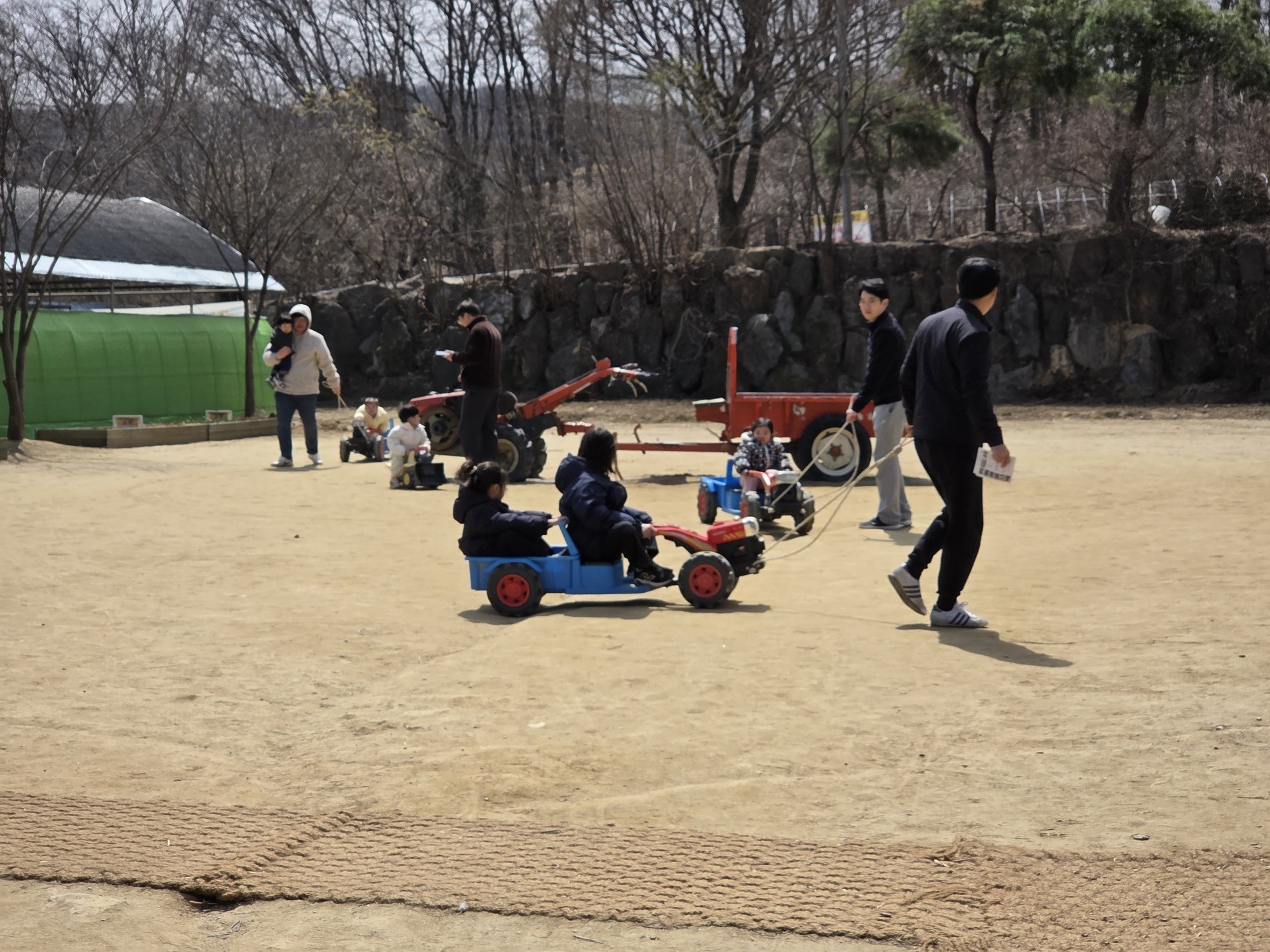 넓은 마당 한 켠에는 아이들이 자유롭게 타고 놀 수 있는 경운기와 다양한 탈 것들이 마련되어 있습니다. 특히 경운기는 아이들이 직접 운전하는 흉내를 내며 즐거워했는데, 이때 아빠의 역할이 중요합니다! 경운기를 끌어주며 아이가 안전하게 놀 수 있도록 도와주세요. 아이 손이 다치지 않도록 항상 주의를 기울여야 합니다.
