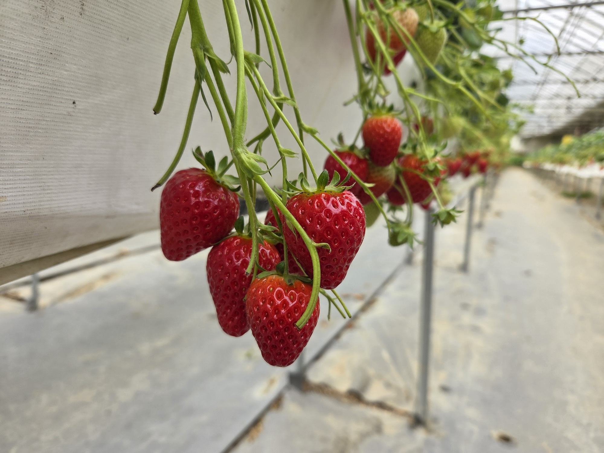 하우스 문을 열자 달콤하고 향긋한 딸기 향이 기분 좋게 코를 간지럽혔습니다. 마치 빨간 보석처럼 탐스럽게 익은 딸기들이 주렁주렁 매달려 있는 모습에 아이는 눈을 반짝이며 탄성을 질렀어요. 딸기 따는 방법을 친절하게 설명해주시고, 라인 하나를 배정해주셔서 그 라인에서 딸기를 땄습니다.